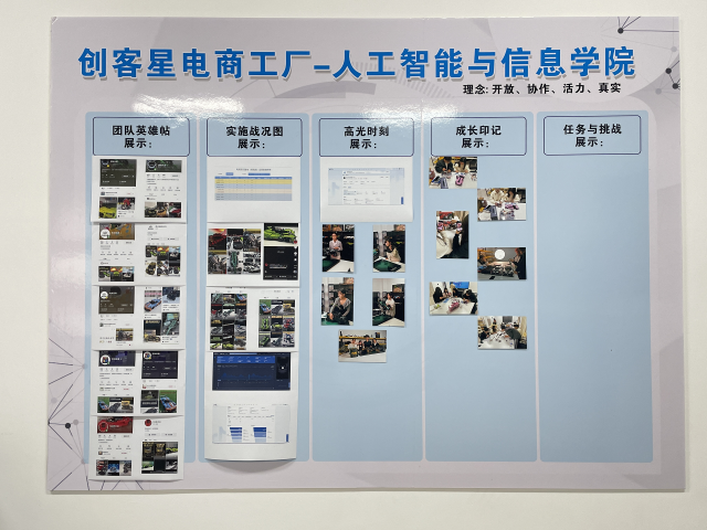 社团通过展板形式,在实训基地集中展示了各项成果:各账号主页截图、直播现场照片、积木拼搭过程记录、内容制作场景、高质量作品特写以及直播后台数据截图。同时,也以成长照片墙的形式,呈现了各小组在发展过程中的精彩瞬间。