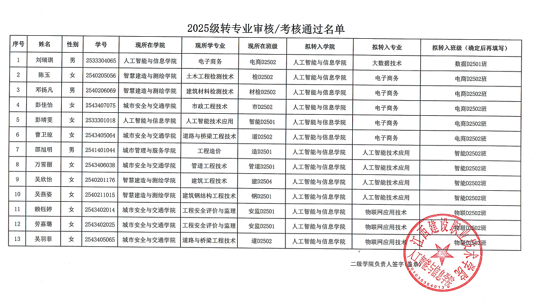 人工智能与信息学院2025级转专业审核/考核通过名单公示